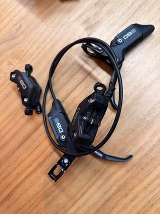 Set de frenos hidráulicos SRAM DB8 de 4 pistones. - Manetas de freno. - Pinzas de freno. - Latiguillos.