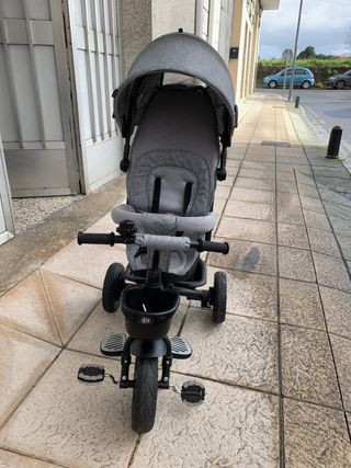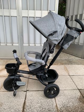 Triciclo Kinderkraft en color gris, ideal para paseos. - Manillar para control parental. - Capota para proteger del sol. - Cesta de almacenamiento. - Reposapiés.