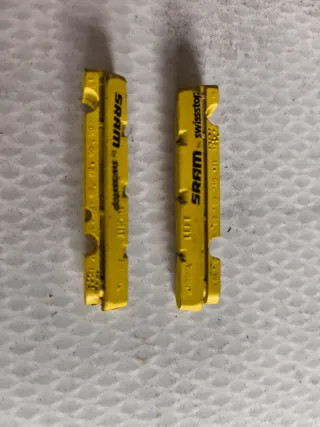 Zapatas de freno SRAM para carbono, fabricadas por Swissstop. Diseñadas para un frenado eficiente. - Compatibles con frenos de llanta - Compuesto para carbono. Tiene medio uso como se ve no llega al límite. Para bici de carretera Cervelo Specialized Trek Colnago Rival Ultrega durace Shimano