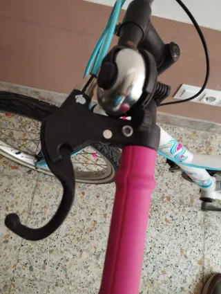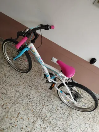 Bicicleta infantil Btwin con un diseño alegre y llamativo. - Cuadro de color blanco con detalles en azul y rosa. - Puños y sillín de color rosa. - Ruedas de 20 pulgadas.