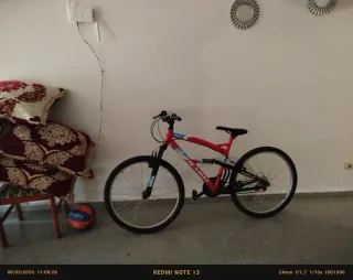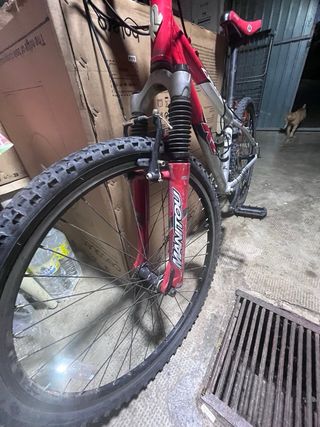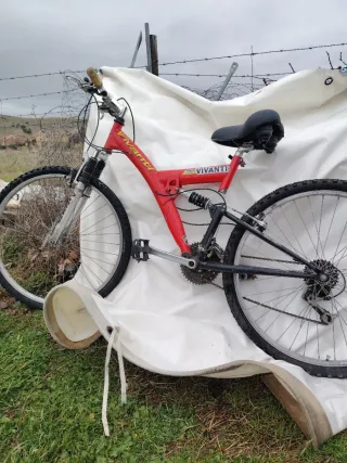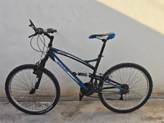 Bicicleta de montaña con doble suspensión, ideal para terrenos irregulares. Cámara y neumáticos recién cambiados, tija recién cambiada. La piel del sillín está dañada. Se vende sin el retrovisor. - Cuadro de doble suspensión. - Ruedas de 26 pulgadas. - Frenos de disco. - Cambio de marchas. - Sillín deportivo.