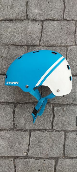Casco de bicicleta Btwin T520 en azul y blanco. Está en buen estado. - Marca: Btwin - Modelo: T520 - Color: Azul y blanco -P rácticamente no se usó,los pequeños desperfectos de las fotos son de apoyarlo en el suelo.