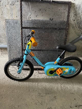 Bicicleta infantil de color azul, ideal para los más pequeños. - Ruedas de 12 pulgadas. - Pedales naranjas. - Diseño divertido con dibujos.