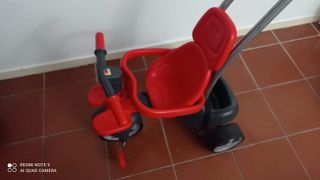 Triciclo infantil de color rojo, ideal para los más pequeños. Cuenta con un práctico empujador para que los adultos puedan guiarlo. - Asiento ergonómico. - Barra de empuje. - Ruedas resistentes.