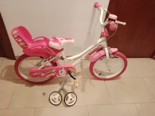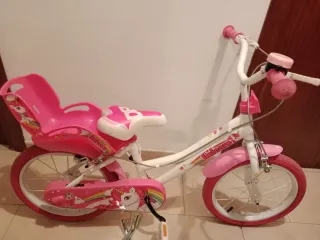 Bicicleta infantil con diseño de unicornio, ideal para niñas. - Ruedas de 16 pulgadas. - Asiento y sillín rosa. - Incluye ruedines de apoyo. Está en buen estado,no hay que hacerle nada,lista para usar.si el anuncio sigue puesto es que todavía la tengo