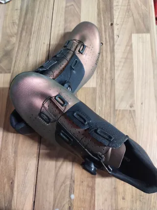 Zapatillas de ciclismo Fizik Tempo en talla 45. Diseñadas para carretera. 2 usos - Cierre BOA. - Color bronce metalizado y negro. - Suela rígida carbono para máxima transferencia de potencia.
