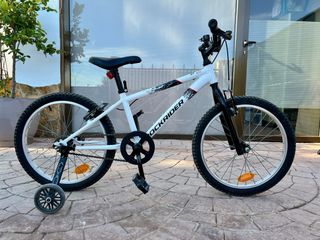 Bicicleta Rockrider ST100 en color blanco y negro. - Cuadro de aluminio. - Ruedas de 20 pulgadas. - Frenos V-brake. - Sillín ajustable. - Ruedines. - Casco. Entrega en mano. No envío