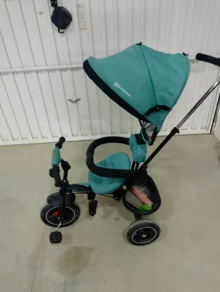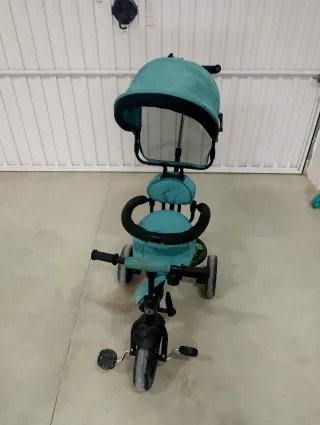 Triciclo infantil con capota protectora y barra de empuje. - Color turquesa. - Capota con malla. - Barra de empuje. - Reposapiés. - Ruedas.
