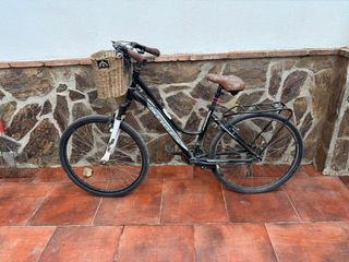 Bicicleta de paseo Conor Malibú. Bicicleta de alta calidad, montada con componentes Shimano. -Transmision 3 platos y 7 piñones, con desviador Shimano y cambio Shimano -Horquilla delantera con suspensión -Tija sillín con amortiguador. -Potencia manillar con regulación de altura -Cesta de quita y pon - Luz delantera (nueva) con dinamo integrada en el buje de rueda -Luz trasera. -Neumaticos 26" mixto Schwalbe Está como nueva. Muy cómoda para el día a día. Gracias a su suspensión se puede circular por vía rural con comodidad.Se puede ver sin compromiso. Preguntar cualquier duda . Talla WS ( 42cm) para personas de 1'70 más menos.
