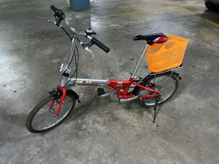 Bicicleta plegable GOTTY F20, ideal para paseos urbanos. Cuenta con 14 marchas para facilitar el pedaleo, muy ligera material aluminio. - Color principal: rojo y plateado. - Incluye cesta de color naranja. - Ruedas de tamaño reducido, típicas de bicicletas plegables.