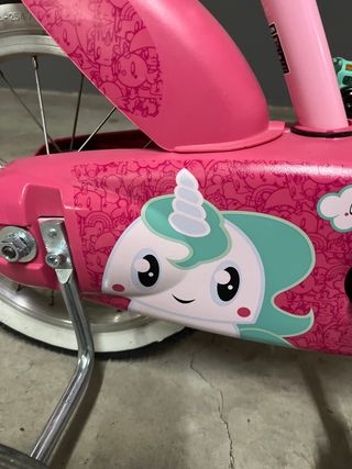 Bicicleta infantil de color rosa, ideal para los primeros paseos. - Diseño con unicornio. - Ruedines incluidos. - Pedales y puños de colores. - Marca BTWIN.