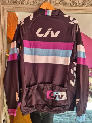 Maillot de invierno de la marca Liv, modelo TL, con mangas largas. - Diseño con franjas horizontales en colores rosa, azul claro y blanco. - Logo de Liv en blanco en la parte frontal. - Cremallera completa en la parte delantera.
