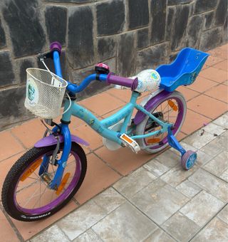 Bicicleta infantil de 16 pulgadas con temática de Frozen. Ideal para las primeras aventuras sobre ruedas. - Color azul y morado. - Incluye ruedines desgastados pero siguen cumpliendo su función , se pueden quitar si ni hacen falta - Cesta delantera algo oxidata - Sillín y asiento trasero en perfectas condiciones La bici tiene años y tiene signos de desgaste per funciona perfectamente