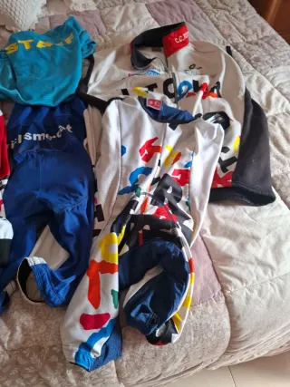 Conjunto de ropa de ciclismo profesional, ideal para entrenamientos y multicolor. De segunda mano pero bien Tallas L o XL - chaleco cremellera s.m - Mallorca igual chaleco - camiseta m.corta - 2 mallo5s uno azul.i uno negro