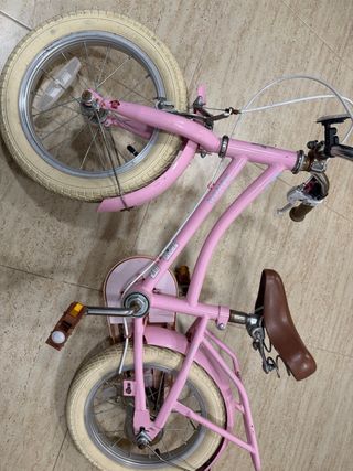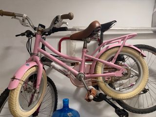 Bicicleta infantil de color rosa, ideal para los más pequeños. - Ruedines incluidos. - Pedales de seguridad. - Sillín ajustable. Venia sin ruedines y se le ha agregado. Usada dos veces. Esta nueva