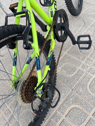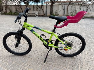 Bicicleta infantil de la marca Rockrider, ideal para los más pequeños. Creo que las ruedas son de 20”. La ha usado mi hija entre los 6 y 8 años. Necesita algo de mantenimiento como se ve en las fotos. - Color verde llamativo. - Sillín negro. - Portabebés rosa incluido.