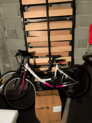 Se venden dos bicicletas infantiles, una para niño y otra para niña, junto con dos somieres completos con sus patas. - Bicicleta infantil (niña) de color blanco y rosa. - Bicicleta infantil (niño) de color negro. - Dos somieres individuales con patas.