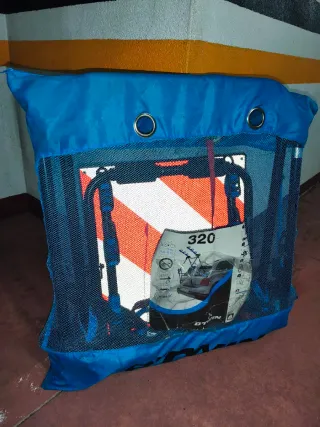 Portabicicletas plegable de la marca B'Twin, modelo 320. Diseñado para facilitar el transporte de bicicletas. - Estructura plegable para un almacenamiento compacto. - Color azul y detalles en naranja y blanco. - Incluye etiqueta con información del producto. - INCLUIDA SEÑAL V-20 (OBLIGATORIA PARA CIRCULAR)