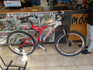 Bicicleta de montaña Specialized con un diseño deportivo en colores rojo y blanco. - Cuadro de aluminio. - Suspensión delantera. - Frenos de disco.