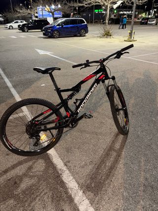Bicicleta de montaña Rockrider en color negro y rojo. Ideal para disfrutar de rutas y senderos. - Cuadro de aluminio. - Suspensión delantera y trasera. - Frenos de disco. - Ruedas de 27.5 pulgadas. -Se vende por falta de uso.