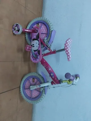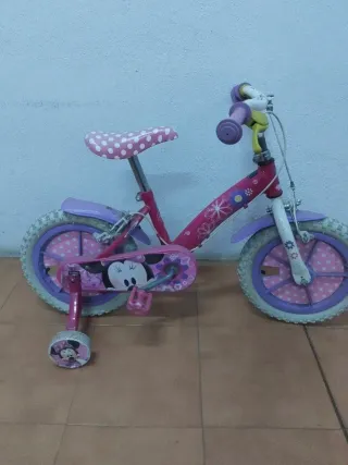 Bicicleta infantil con diseño de Minnie Mouse. - Color principal rosa. - Ruedines de apoyo incluidos. - Detalles de lunares blancos.