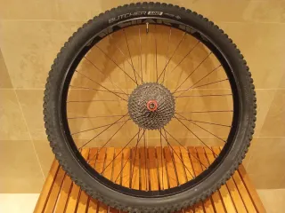 Vendo rueda trasera completa de 29 pulgadas, centrada y sin golpes. Llanta de aluminio Black Jack ETRTO 622 x 30TC (ancho interior de 30mm). Buje Boost de diámetro 12 con una longitud de 148mm (Boost 12x148), núcleo HG con cassette de 11 velocidades Rel.: 11/42 y disco de freno de 160mm. Aro con 32 radios. Neumático Specialized - Butcher Gris 29 x 2.60 (66 - 622). Cámara NUEVA, la acabo de montar, una Massi compatible con 29 x 2.50/3.0. Bicicleta, bici, montaña, mtb, btt, rueda, llanta, aro, Boost, neumático, cubierta, cámara, recámara, disco, freno, caset, cassette, piñonera, piñones, corona, repuesto, recambio. BUEN ESTADO.