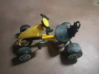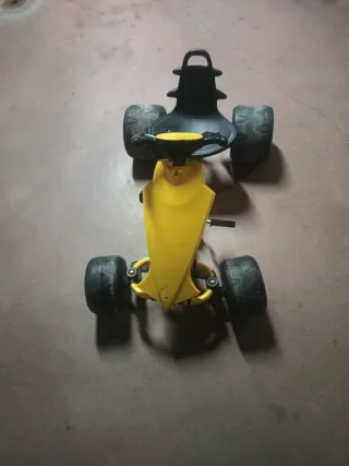 Divertido coche a pedales de color amarillo para niños. - Diseño deportivo. - Ruedas de goma. - Volante para dirigir. Tiene una pequeña grieta en el plástico de adelante.