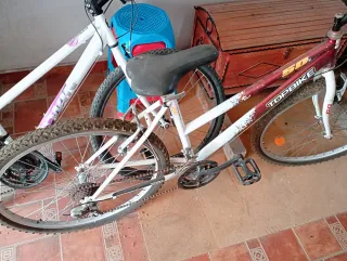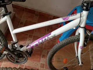 Bicicleta de montaña con un diseño llamativo. - Cuadro de color blanco. - Detalles en morado y rosa. - Ruedas todoterreno. Las ruedas están para revisar, llevan tiempo sin usar. Una bicicleta 50 las 2 bicicletas 90