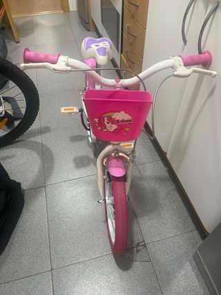 Bicicleta infantil de color rosa, ideal para las primeras aventuras. - Cesta delantera con diseño de unicornio. - Puños rosas. - Sillín con detalles morados. tengo también la tapa de unicornio, sillita para llevar muñeca y ruedines