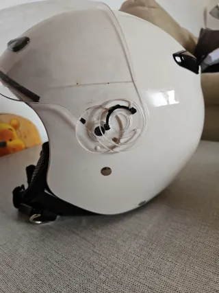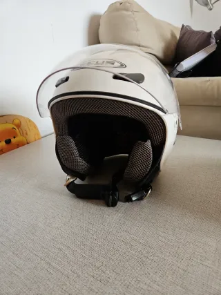 Casco de la marca Zeus, talla S con circunferencia de 55cm. Tiene una parte de la visera rota (se ve en la foto), facil arreglable. Funciona igualmente. - Color blanco. - Visera transparente. - Cierre de seguridad. Precio negociable.