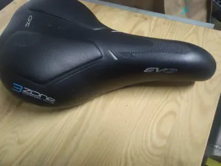Sillín de bicicleta en color negro con detalles en azul y plateado. - Diseño 3Zone. - Modelo EVO. - Superficie con textura antideslizante. Gel