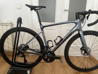 Bicicleta de carretera Specialized S-Works en color blanco con detalles en rojo y negro. Diseño aerodinámico y componentes de alta gama. Talla M 52 - Cuadro S-Works. - Ruedas de carbono. - Manillar curvo.
