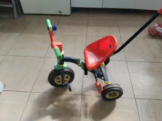 Triciclo infantil con asiento rojo y manillar. - Ruedas de goma. - Manillar de empuje para adultos. - Estructura de plástico y metal.