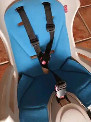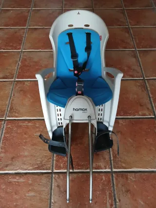 Silla de seguridad para bicicleta marca Hamax, modelo Smiley. Diseñada para el transporte de niños. - Color blanco y azul. - Cinturón de seguridad de 5 puntos. - Reposapiés ajustables. - Con un extra de largura del soporte para poderlo usar con bicicletas con ruedas de un diámetro grande