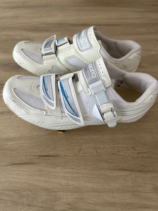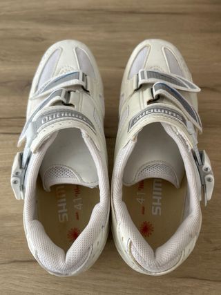 Zapatillas de ciclismo de carretera Shimano en color blanco. Cierre con velcro y hebilla. - Marca: Shimano - Color: Blanco - Cierre: Velcro y hebilla