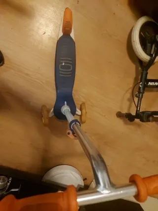 Patinete infantil de tres ruedas con manillar ajustable y plataforma antideslizante. - Ruedas de goma. - Empuñaduras naranjas. - Plataforma azul con diseño.