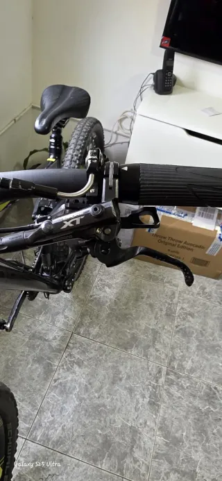 Bicicleta de montaña con manillar negro y puños texturizados. - Manillar negro. - Puños texturizados para mejor agarre. - Frenos. - Cambios de marcha.
