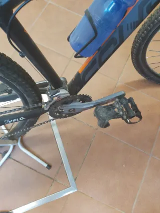 Bicicleta de montaña con cuadro negro y detalles naranjas. - Rueda delantera visible. - Pedales negros. - Botella de agua azul.