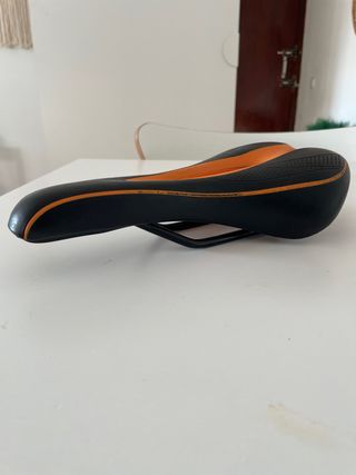Asiento de bicicleta con un diseño deportivo y moderno. - Color negro con detalles en naranja. - Materiales resistentes y duraderos. - Diseño ergonómico para mayor comodidad.