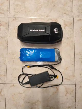 Pack Extender con bolsa impermeable Top Active y cargador para Bicicleta Ebike y Patinete Electrico universal, para cualquier marca y modelo, 36w - Bolsa de color negro con logo. - Batería envuelta en plástico azul y cinta plateada. - Cargador negro con cables.