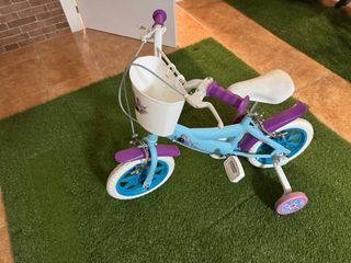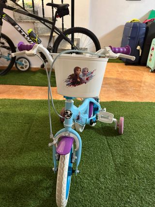 Bicicleta infantil con diseño de Frozen. Ideal para los más pequeños. - Color azul y morado. - Canasta delantera con personajes de Frozen. - Ruedines traseros para mayor estabilidad.