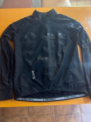 Chaqueta Etxeondo de color negro en talla M. Presenta un diseño moderno y funcional. - Tejido con tecnología GORE-TEX INFINIUM. - Banda elástica con logo Etxeondo en la cintura. - Cremallera frontal completa.
