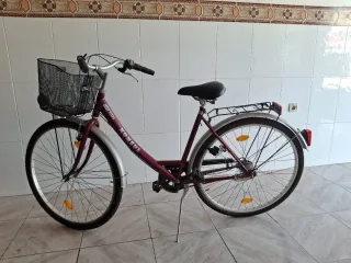 Bicicleta urbana de color burdeos con cesta delantera y portabultos trasero. - Cuadro de metal. - Ruedas de 26 pulgadas. - Guardabarros delantero y trasero. - Reflectores en las ruedas y pedales.