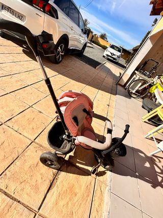 Triciclo infantil con un diseño moderno y cómodo. - Color rosa y blanco. - Marca Futuro. - Capota protectora. - Cesta delantera. - Reposapiés.