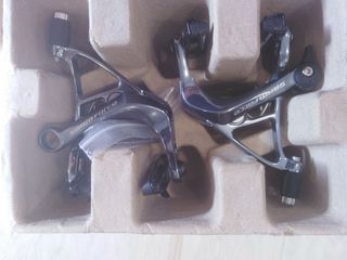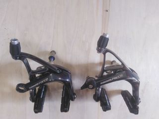 Par de frenos de carretera Sram Force nuevos a estrenar, en un puente falta la cogida del cable