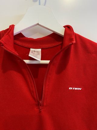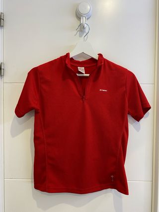 Camiseta de manga corta para niño, ideal para montar en bicicleta. Color rojo. - Tejido técnico transpirable. - Cremallera frontal. - Logo de la marca Btwin.
