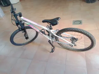 Bicicleta de montaña con un diseño deportivo y llamativo. - Cuadro de doble suspensión. - Ruedas todoterreno. - Frenos de disco. Las 3 por 150€