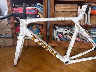 Cuadro de bicicleta Trek Madone. - Talla L. - Diseño blanco con detalles dorados. -Negociable -Manillar 420x90