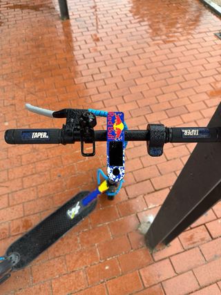 Patinete eléctrico con un diseño deportivo y llamativo. - Decoración con logos de KTM y Red Bull. - Ruedas negras. - Base antideslizante. -25km/h,52km/h