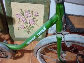Bicicleta clásica Derbi Rabasa en color verde, ideal para coleccionistas o para restaurar. - Cuadro de bicicleta vintage. - Ruedas de 20 pulgadas. - Incluye cesta delantera y portabultos trasero.